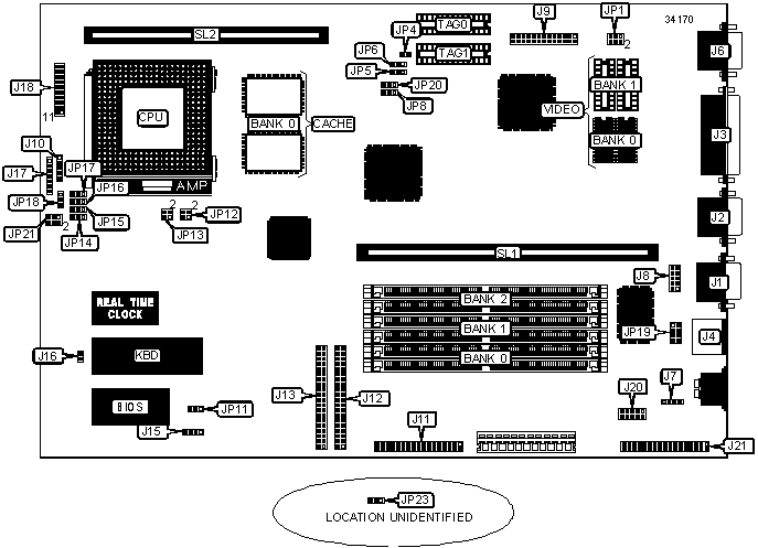 Floppy drive interface, green PC connector, IDE interfaces (2), parallel port, PS/2 mouse port, serial ports (2), VGA feature connector, VGA port, riser slot, cache slot, IR connectors (2), USB connector, CD-ROM audio connector, wavetable connector, Modem Blaster Pro connector, audio interface connector