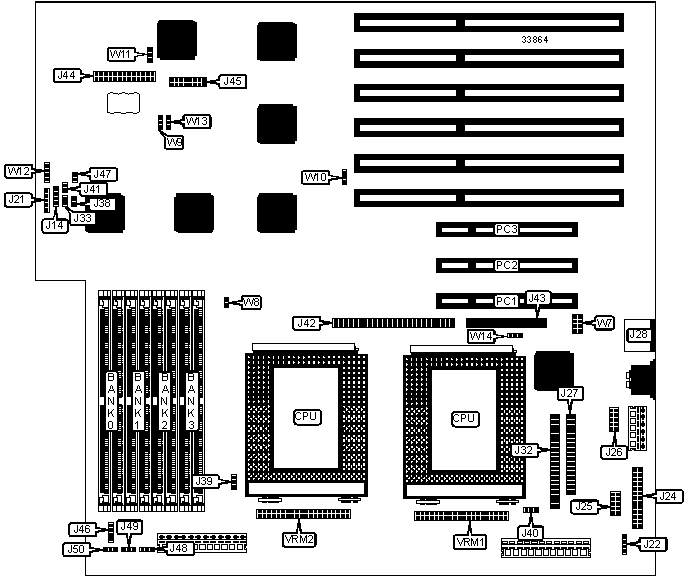 32-bit PCI slots (3), floppy drive interface, IDE interface, SCSI interface, Ultra Wide SCSI interface, parallel port, PS/2 mouse port, serial ports (2), VESA feature connector, VGA interface, IR connector, VRM connectors (2), soft power standby/signal connector, soft power switch